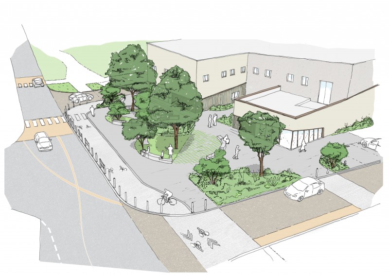 - Aménagement d’un parvis devant le pôle santé, créant une place piétonne vectrice de convivialité, où le végétal sera prédominant (principe de renaturation grâce à des ilots de verdure) ;