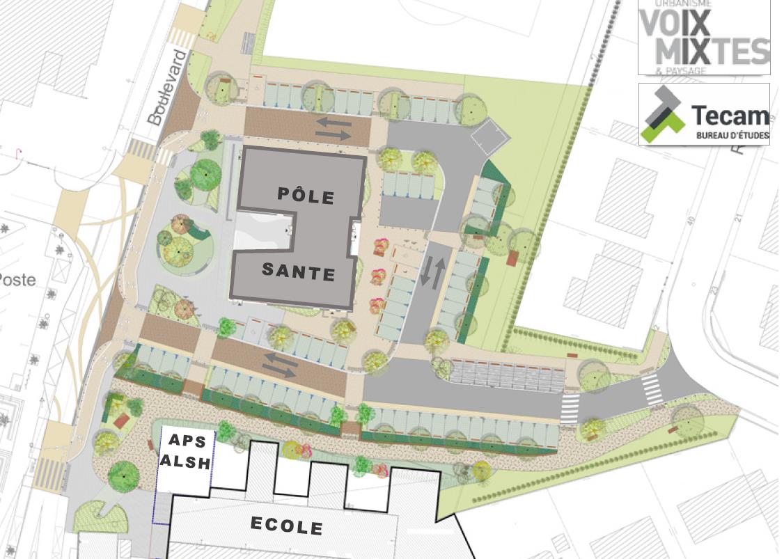 L’une des premières phases de mise en œuvre de ce plan-guide correspond aux aménagements d’espaces publics sur environ 7000 m² autour du futur pôle santé. Cette opération s’accompagnera de la création d’une voie verte reliant l’entrée nord du bourg.